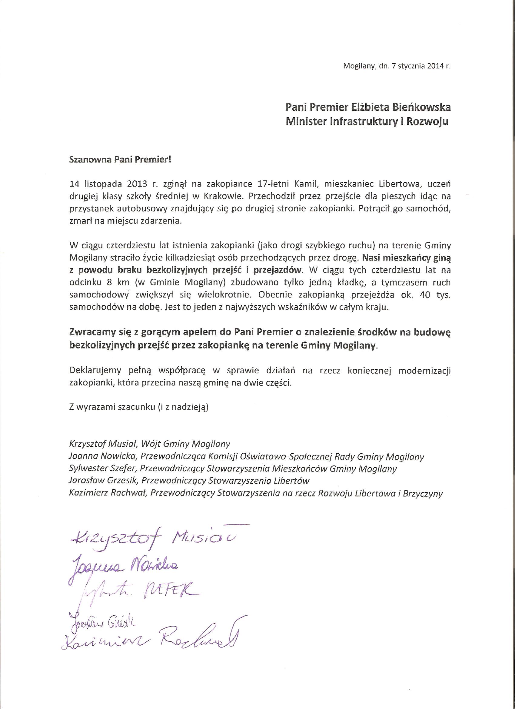 7 stycznia 2014 r. poseł Józef Lassota (PO) przekazał postulaty mieszkańców naszej gminy Ministerstwu Infrastruktury i Rozwoju. Spotkał się z pełnomocnikiem rządu ds. zarządzania infrastrukturą drogową Zbigniewem Rynasiewiczem oraz z minister Elżbietą Bieńkowską.